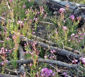 The purple blooms of Fireweed are a sign of recovery from the fire. In many areas of the park, especially in the river valleys, an intermediate forest (saplings 1-2 inches in diameter) has returned, and Sylvan Pass is no exception.