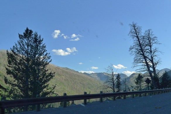 The 1988 fire burned everything along Sylvan Pass. Green appears again as the forest recovers, but many stands of dead Lodgepole Pine remain.