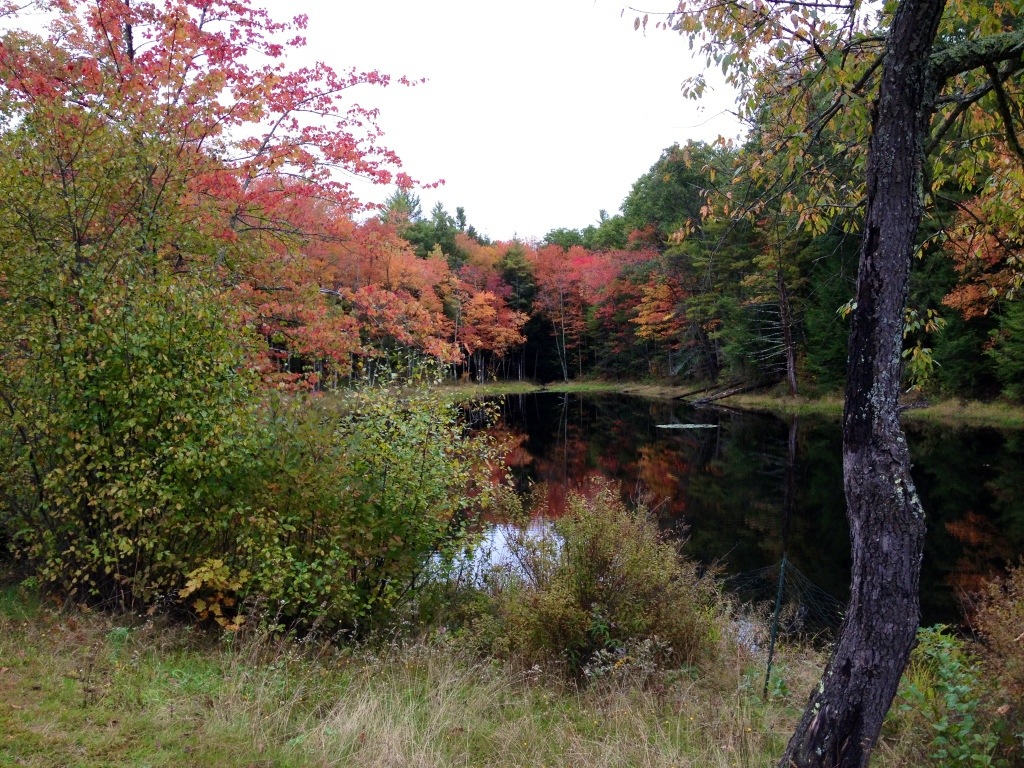 The weather stays its course: grey, calm and damp. There is no wind to roil the water in the pond. I wandered about the lawn thinking about the stone fences that cross-cross the lot, going up the hill and following the creek.
