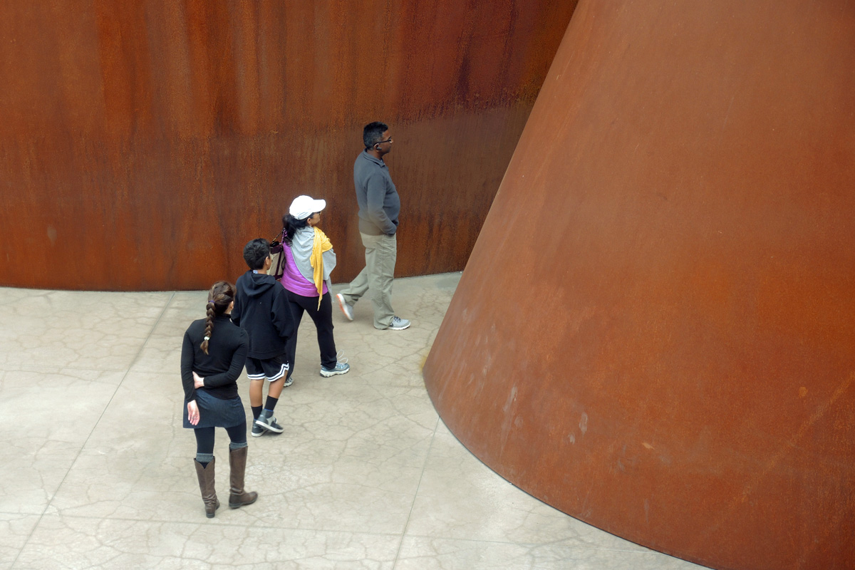 Visitors entering Richard Serra’s steel sculpture, Sequence, installed on a reinforced concrete patio at the Cantor Art Center, Stanford.