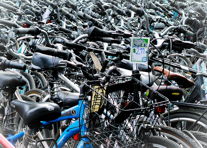 Weeks before the start of term, the bikes are readied for sale. They overflow the shop and fill up the plaza by Tresidder Union. Many of these shinny bikes will abandoned on campus at the end of term— the sheriff tags and picks up the discarded bikes, and the cycle of change goes on.