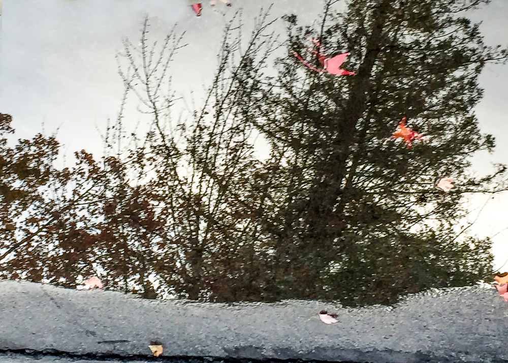 A sudden rain storm filled the street— first rain of the season. Oh, how we need the water. Reflections in a puddle in front of my house.