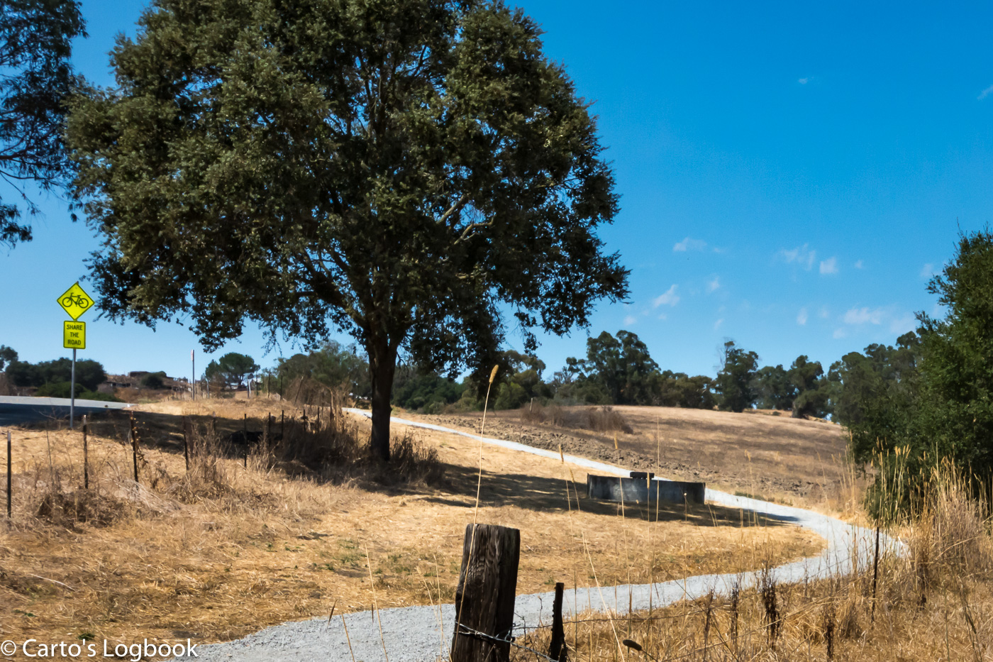 A foot path curves up the hill in Palo Alto’s Arastradero Preserve. Last fall’s grass is golden and very dry — fire danger high. Recreational bikers use the road shown in the upper left of the photo; Share the Road.