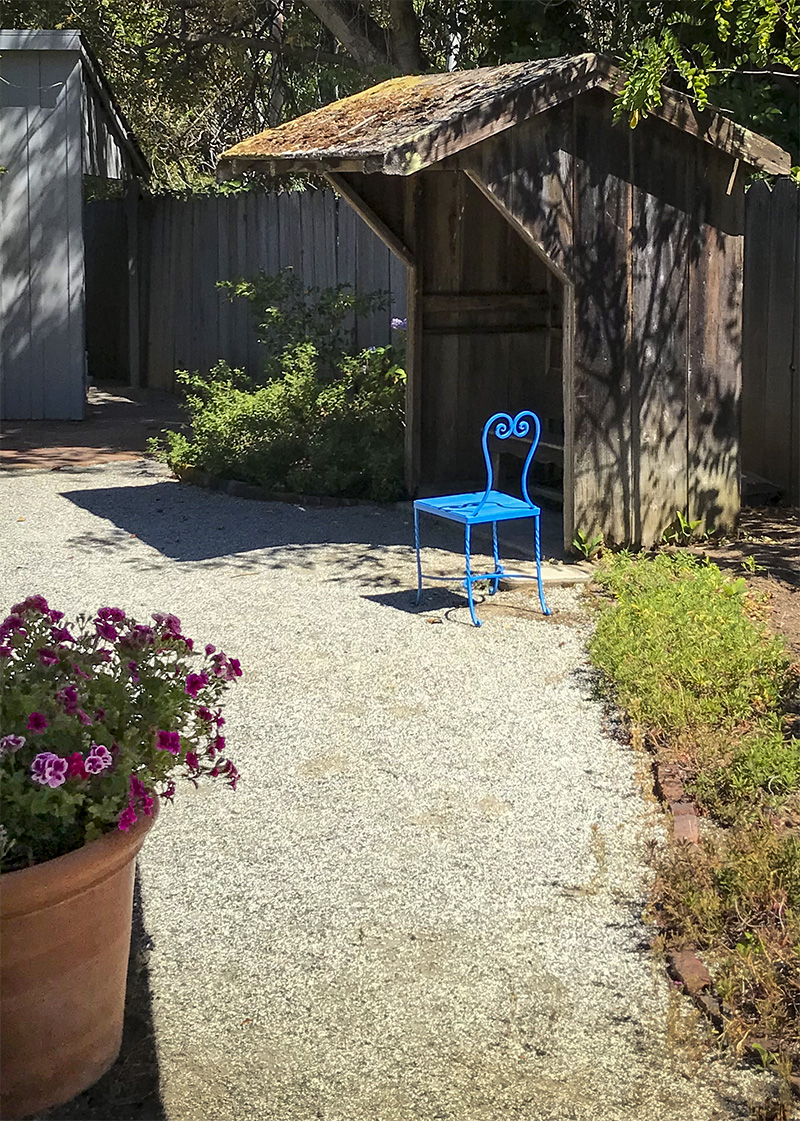 Blue chairs are a disbursed throughout the three acre grounds of the Allied Arts Guild in Menlo Part. This chair was too hot to sit on, but makes an interesting composition. This image was taken with my iPhone 7 in full sun. I first exposed for the bright light of the gravel. This left the flowers in the foreground in darkness so I took a second shot exposed for the darkness. Later, I composed the two photos in Photoshop.