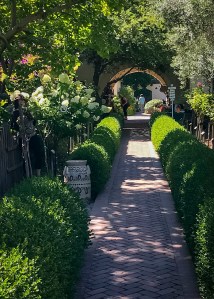 “The original barn and sheep sheds were preserved and the new Spanish eclectic buildings were surrounded by gardens which Delight had seen in the Alhambra in Granada. The gardens—with names such as “The Court of Abundance”, “The Garden of Delight”, and “Cervantes Court”, and filled with oranges. lemons, pomegranates, roses, heliotrope and jasmine—blended with paths whose stones and pebbles were from San Francisquito Creek. Six painted murals by Maxine Albro, a disciple of Diego Rivera and tiled wall murals by the de Lemos family provided a story–book setting for the making and selling of hand-made furniture and pottery, woven fabrics and metal light fixtures. Many of the latter still hang in the Awahnee, the Palo Alto Community Center and Birge Clark houses.” —Margaret Feuer, for PAST.